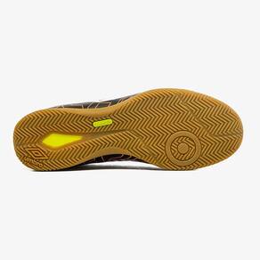 O solado de futebol indoor é composto por borracha, oferecendo durabilidade e aderência ao solo. Além disso, inclui a tecnologia STEALTH de amortecimento no calcanhar para maior conforto durante as partidas.