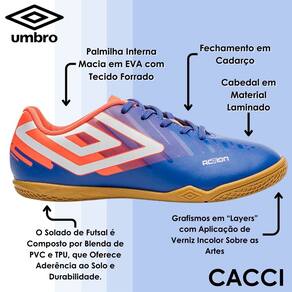 Cabedal confeccionado em material laminado de fácil limpeza e manutenção. Possui grafismos em “layers” com aplicação de verniz incolor sobre as artes, Diamante Umbro em destaque na lateral, assinatura do modelo na parte frontal e palmilha interna macia em EVA com tecido forrado. O solado de futsal é composto por blenda de PVC e TPU, que oferece aderência ao solo e durabilidade.