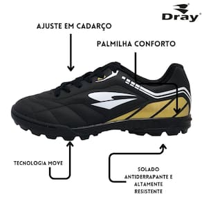 Com as chuteiras Dray com Tecnologia MOVE e Costura Frontal, você estará pronto para dominar o campo, com controle aprimorado e movimentação ágil que fazem a diferença no seu jogo. Escolha a qualidade e o estilo da Dray para elevar seu desempenho no futebol.