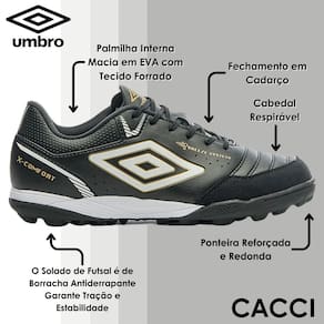 A Chuteira Society Umbro X-Comfort oferece amortecimento, conforto e durabilidade. O modelo conta com sistema de alta respirabilidade BREEZE SYSTEM, que são pontos perfurados posicionados para proporcionar uma melhor ventilação. A palmilha interna X-Comfort em EVA e o solado do mesmo material de ponta a ponta, oferece amortecimento a cada passada.
