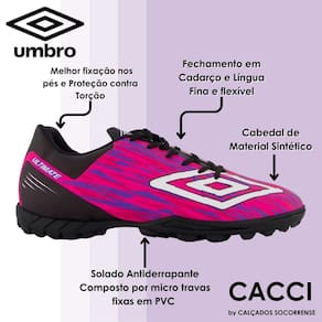 Desenvolvida pela Umbro, a chuteira Ultimate, é perfeita para os craques demonstrarem todas as suas habilidades nas partidas de society. O calçado é feito em material sintético, exibe design nas cores rosa e roxo e traz solado com micro travas fixas.