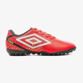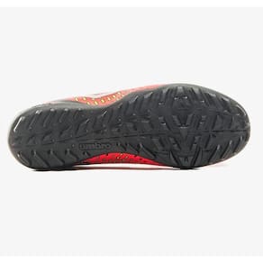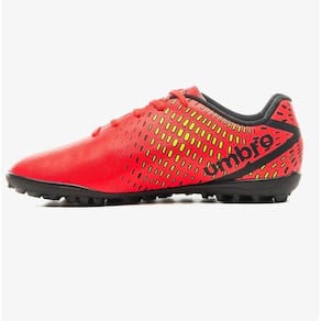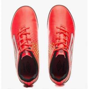 Cabedal (parte superior do calçado) construído em material sintético com textura suave e acabamento laminado. Possui serigrafia de arte gráfica personalizada em degradê com sobreposição de três cores, Diamante Umbro na lateral, forro em poliéster e macia palmilha em EVA com forração de tecido. O solado de society HG é em PVC monocromático, que proporciona maior durabilidade.