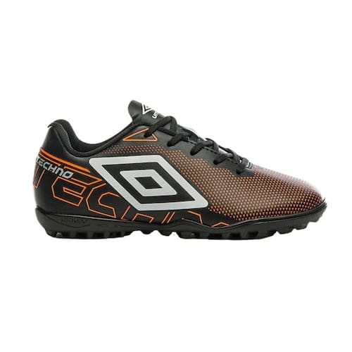 A Chuteira Umbro Techno Jr Society Infantil Preto Laranja Branco é ideal para jovens jogadores de gramado sintético, com estilo único traz grafismos 3D na área do chute. O cabedal laminado oferece durabilidade, já o forro traseiro em mesh respirável garante conforto. A palmilha forrada e macia em EVA traz amortecimento, já o solado de futebol society HG em PVC confere tração e estabilidade.