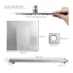 Chuveirão inox 25x25 slim parede banheiro A ducha possui bicos de silicone que possibilitam um bom fluxo dágua e aumentam a sua durabilidade, conta com um sistema de articulação de 20 que permite ajustar a posição da ducha para um banho mais confortável. Ducha na cor tradicional do inox com acabamento brilhoso, feito em aço inox 201 garante dureza e resistência ao produto, reduzindo a oxidação. A ducha também conta com uma tela para filtragem de água arenitos ou detritos reduzindo possíveis entupimentos dos bicos da ducha.