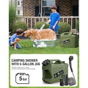 - Kit de chuveiro de acampamento versátil: este chuveiro portátil para acampamento é leve e compacto, perfeito para caminhadas, limpeza de animais de estimação, limpeza de carro e viagens à praia, irrigação de plantas. O balde de 5 galões pode armazenar água para acampamento ao ar livre, além de armazenar bebidas, cerveja para jantares em família e muito mais. Ótimo presente para entusiastas de atividades ao ar livre.