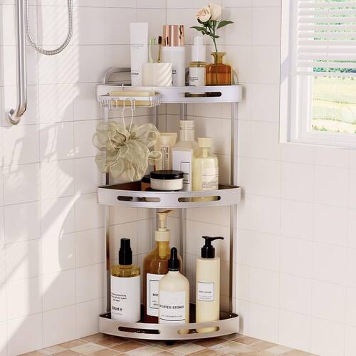 Binecer Suporte de chuveiro de canto, suporte organizador de chuveiro de 3 camadas com suporte de sabonete, prateleiras de chuveiro à prova de ferrugem para armazenamento de banheiro, prata - ?Grande capacidade e economia de espaço?Este suporte de chuveiro de canto vem com 3 cestos, cada camada pode suportar até 5,9 kg. O design triangular de canto pode melhorar a utilização do espaço, tornando-o perfeito para armazenamento de canto, como banheiro, banheira e qualquer outro espaço que precise de armazenamento. - ?Armazenamento multifuncional?Este organizador de chuveiro de canto tem várias camadas para você escolher. Possui um suporte de sabão de design exclusivo com ganchos de barbear para armazenar aparelhos de barbear, tornando-o perfeito para armazenar frascos grandes de xampu, sabonete líquido, sabonete, lâminas de barbear e outros itens, ajudando você a criar um banheiro confortável e arrumado. - ?Material resistente à ferrugem?Este suporte de chuveiro é feito de alumínio de alta qualidade, o que o torna adequado para uso em ambientes úmidos, como banheiros. As cestas têm design de orifício de quatro folhas, evitando efetivamente o acúmulo de água e permitindo um armazenamento eficiente. - ?Suporte de chuveiro de canto antiderrapante? Este suporte organizador de chuveiro tem 5 pés de suporte para manter estável e cada um deles é equipado com manga de borracha, o que significa que possui antiderrapante e anti-inclinação enquanto protege seus móveis - ?Prateleira de chuveiro de canto elegante?Esta prateleira de banheiro tem um design elegante que complementa a estética moderna do banheiro. Vem com ferramentas de instalação para facilitar a montagem, permitindo que você realize seus sonhos de armazenamento em apenas alguns minutos