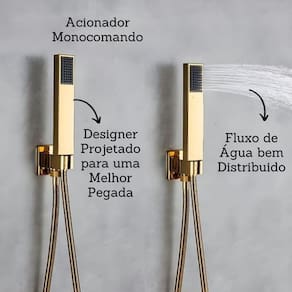 Chuveiro Dourado Brilhante Quente e Frio Duchinha Moderno Material: Metal Linha: Grammyn Showers - Produto NÃO-ELÉTRICO: indicado para uso somente com aquecedores. A gás, solar ou elétrico. Vazão: 9 a 60L/min Função: Chuveiro Conjunto de Torneira Acabamento: Dourado Número de Identificadores: Único Punho Cabeça de chuveiro Material: Metal Tamanho da Cabeça do Chuveiro: 30cm Tipo de válvula: Válvula de cerâmica Material Do Corpo do Chuveiro: Metal Chuveiro de mão Material: ABS Plástico Tenha um chuveiro em seu banheiro design moderno e elegante, com a certeza de qualidade