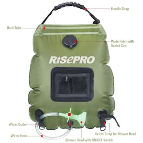 MATERIAIS DE QUALIDADE SUPERIOR A bolsa de banho RISEPRO é feita com materiais ecológicos que são s para a saúde humana. Esta versão deluxe com várias camadas pode aprimorar ainda mais o recurso à prova de vazamentos e torná lo ainda mais durável CABEÇA DE DUCHE AVANÇADA Esta cabeça de chuveiro avançada oferece um interruptor liga, desliga fácil com fluxo de água BAIXO a ALTO. Traz lhe uma experiência de banho muito melhor ALTA CAPACIDADE DE ÁGUA Esta bolsa útil pode transportar facilmente até 5 GALÕES 20 litros de água para tomar banho em áreas remotas Um banho agradável e refrescante em qualquer lugar DESIGN SMART HEAT ABSORBING O material SMART PVC pode absorver eficientemente a energia solar para aquecer a água dentro da bolsa. Aquece a água a 113F 45C em 3 horas com luz solar direta Marca: Não Informado