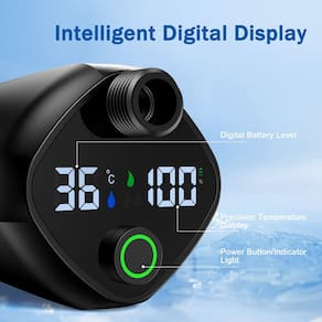 -?Design inteligente, fácil de operar?O chuveiro de acampamento TRJZWA é muito fácil de usar, pressione e segure o botão por 3 segundos para iniciar a bomba. Display digital inteligente - display de energia em tempo real e display de temperatura, a bomba de chuveiro tem duas engrenagens para alternar e é equipada com 3 modos de chuveiro e interruptor de parada de água. Você pode facilmente alternar modos diferentes girando o interruptor no chuveiro.