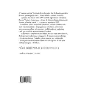 A "cidade partida" do título deste livro é o Rio de Janeiro, cenário de uma verdadeira guerra: a da sociedade contra os bandidos. Edição especial de 30 anos com prefácio de Mauro Ventura. Durante dez meses, Zuenir Ventura, autor de 1968: o ano que não terminou, frequentou a favela de Vigário Geral (tristemente famosa pela chacina de 21 pessoas em agosto de 1993), convivendo com o outro lado da cidade, onde a vida não vale nada e a violência é a linguagem do cotidiano. Ao mesmo tempo, acompanhava ativamente a mobilização da sociedade civil contra a violência, que resultou no movimento Viva Rio. Este livro é o impressionante relato, muitas vezes emocionado, deste correspondente de uma guerra de lances surpreendentes e heróis inusitados, cuja solução não consiste meramente em destruir um suposto inimigo, mas em incorporar a massa de excluídos à sociedade. *Prêmio Jabuti 1995 de Melhor Reportagem.