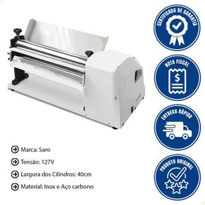 - Fabricado pela Saro, referência no setor, este modelo oferece 40cm de cilindragem elétrica contínua, perfeita para panificadoras, pizzarias e confeitarias exigentes.