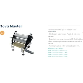 O Cilindro de Massas Sova Master da Anodilar tornou a tarefa de preparar massas muito mais rápida e prática. Ele é ideal para laminar massas de pães, lasanhas, pastéis, e os mais diversos tipos de massas para salgados. Os cilindros são cromados, o que garante muito mais resistência e durabilidade, possuem regulagem de espessura para evitar variações na espessura da massa, deixando-a sempre uniforma. Além disso, ele pode ser fixado em superfícies através de morsas reguláveis. Aproveite!