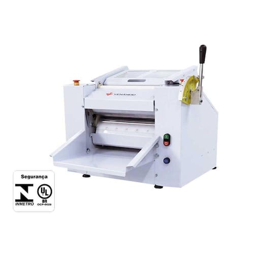 - Equipamentos de acordo com a portaria 371/09 do inmetro, com selo de conformidade expedido pelo mesmo; - Possui proteção móvel inter-travada, que impede o acesso aos rolos pela parte interna (entrada da massa) e que ao ser aberta efetuará a parada imediata dos rolos; - Manipulador para regulagem dos rolos; - Rolos massadores com cobertura em cromo duro; - Estrutura em chapa SAE 1010/1020 reforçada e com acabamento em pinutra a pó eletrostática com base fosfatizada; - Sistemas de raspadores auto-reguláveis; - Motor monofásico com tensão 220V; - Cilindro de mesa para laminar massas de pastéis e similares; - Cilindro profissional com alta capacidade de produção; - Moderno e seguro sistema de abertura de cilindros com sinalizador visual; - Capacidade máxima de 7kg de massa por passada;