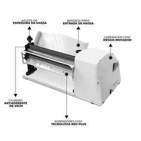 A bandeja de entrada e mesa de apoio reclinável proporcionam ergonomia no trabalho, enquanto os 4 pés emborrachados protegem sua bancada. Com raspadores integrados que evitam o acúmulo de massa e capacidade para processar 20 metros de massa por minuto, é a solução ideal para padarias industriais, confeitarias e cozinhas profissionais que demandam alta produtividade e padrão gourmet.