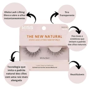 Os cílios postiços da The New Natural White Shirt são sua nova opção de efeito lifting porém sem esforço! Com os fios leves e naturais a coleção possui tão famoso efeito lifting e trazem um olhar mais aberto e com mais volume. Contem com uma tecnologia que imita o padrão natural dos cílios com uma raiz mais alongada. Ainda possuem uma tira transparente que traz naturalidade.