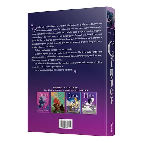 EDIÇÃO ESPECIAL COM CONTO EXTRA. Cinder não caberia em um vestido de baile, de qualquer jeito. Mesmo que encontrasse luvas formais e sapatos em que pudesse esconder suas monstruosidades de metal, seu cabelo sem graça nunca iria segurar um cacho, e não sabia nada sobre maquiagem. Ela acabaria ficando fora da pista de dança, tirando sarro das meninas que desmaiavam para chamar a atenção do príncipe Kai, fingindo que não estava com ciúmes. Fingindo que aquilo não a incomodava. Embora estivesse curiosa sobre a comida. E, agora, o príncipe a conhecia, mais ou menos. Ele tinha sido gentil com ela no mercado. Talvez ele a chamasse para dançar. Por educação. Por cavalheirismo, quando a visse sozinha. Essa fantasia desmoronou tão rapidamente quanto tinha começado. Era impossível. Não valia a pena pensar. Ela era uma ciborgue e nunca iria ao baile. Cinder tem dezesseis anos e é considerada uma abominação tecnológica pela maior parte da sociedade, além de um fardo por sua madrasta. Por outro lado, ser ciborgue tem suas vantagens: a interface de seu cérebro lhe deu a capacidade sobre-humana de consertar tudo — robôs, aerodeslizadores, os próprios membros cibernéticos quebrados —, tornando-a a melhor mecânica de Nova Pequim. Sua reputação faz com que o herdeiro do império, ninguém menos que o príncipe Kai, apareça em seu estande na feira, solicitando o conserto de um androide antes do baile anual. Embora esteja ansiosa para agradar o príncipe, Cinder é impedida de trabalhar no androide quando Peony, sua meia-irmã e única amiga, é infectada por uma praga mortal que tem assolado a Terra por anos. Culpando-a pelo destino da filha, a madrasta de Cinder a entrega como voluntária para os pesquisadores procurando uma cura para a doença, uma "honra" à qual ninguém sobreviveu até então. Logo, porém, os pesquisadores descobrem algo incomum na cobaia recém-adquirida. Algo pelo que certas pessoas estão dispostas a matar.
