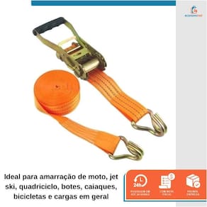 A cinta com catraca é ideal para amarração de moto, jet ski, quadriciclo, botes, caiaques, bicicletas e cargas em geral. Fabricado em aço carbono, fibra de poliéster e 2 ganchos em ABS fixa itens em bagageiros, caçambas ou carretinhas. As cintas são de fácil manuseio e o peso delas em comparação com outros materiais como correntes de aço faz com que os processos de instalação e retirada sejam menos cansativos para os trabalhadores dando maior agilidade no serviço. PARA PRENDER:- Introduza a fita através da abertura e puxe cuidadosamente para cima;- Empurre a alavanca para baixo e para cima para acionar a catraca, até a fita ficar suficientemente firme;- Empurre a alavanca para baixo para travar. Assim a fixação está pronta. PARA LIBERAR:- Puxe a alavanca para baixo na posição A, como mostra o diagrama;- Aperte o desengate rápido para a posição B Aberto Total. Remova a fita da abertura. CARACTERÍSTICAS TÉCNICAS:Material: Aço carbono, fibra poliéster e ABSMedidas: 10m comprimento x 50mm - 2 largura Tensão de torque da fita: 3000 KgTensão de torque da catraca: 3000 KgCarga de Ruptura: 3000kgCapacidade de Amarração: 1500kgEspessura do Gancho nas Extremidades: 9mmMarca: StarferRef.: 3074412 OBS 1: Não Indicado para Elevação de CargaOBS 2: Não dar Nó na CintaOBS 3: CONTRAN - Conselho Nacional de Trânsito é o órgão máximo normativo e consultivo do Sistema Nacional de Trânsito.
