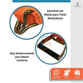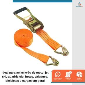 A cinta com catraca é ideal para amarração de moto, jet ski, quadriciclo, botes, caiaques, bicicletas e cargas em geral. Fabricado em aço carbono, fibra de poliéster e 2 ganchos em ABS fixa itens em bagageiros, caçambas ou carretinhas. As cintas são de fácil manuseio e o peso delas em comparação com outros materiais como correntes de aço faz com que os processos de instalação e retirada sejam menos cansativos para os trabalhadores dando maior agilidade no serviço. PARA PRENDER:- Introduza a fita através da abertura e puxe cuidadosamente para cima;- Empurre a alavanca para baixo e para cima para acionar a catraca, até a fita ficar suficientemente firme;- Empurre a alavanca para baixo para travar. Assim a fixação está pronta. PARA LIBERAR:- Puxe a alavanca para baixo na posição A, como mostra o diagrama;- Aperte o desengate rápido para a posição B Aberto Total. Remova a fita da abertura. CARACTERÍSTICAS TÉCNICAS:Material: Aço carbono, fibra poliéster e ABSMedidas: 10m comprimento x 50mm - 2 largura Tensão de torque da fita: 3000 KgTensão de torque da catraca: 3000 KgCarga de Ruptura: 3000kgCapacidade de Amarração: 1500kgEspessura do Gancho nas Extremidades: 9mmMarca: StarferRef.: 3074412 OBS 1: Não Indicado para Elevação de CargaOBS 2: Não dar Nó na CintaOBS 3: CONTRAN - Conselho Nacional de Trânsito é o órgão máximo normativo e consultivo do Sistema Nacional de Trânsito.
