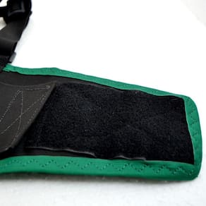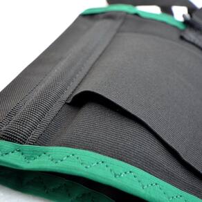 Material: 60 % poliéster 40% elastómero. Resistência ao calor: 180º C Resistência ao frío: -30º C Cor: Preta com acabamento vivo na cor verde Peso: 250 Gramas