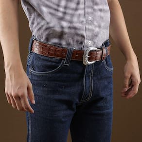 Cinto com a clássica qualidade Cow Way fabricado em couro duplado e costurado de crocodilo na cor Marrom com 4cm de largura, possui fivela de metal removível com detalhes florais. Uma peça realmente bonita e que não pode faltar em seu guarda roupa!