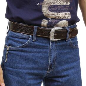 Cinto unissex na qualidade Cow Way, fabricado em couro na cor Marrom seguindo o design e tendências atuais, possui correia totalmente bordada (entalhada), com 3,8cm de largura no centro e nas ponteiras. Este modelo vem costurado ao longo da superfície. Tanto a fivela estilizada como o passador são removíveis, podendo ser trocados pelo usuário a qualquer momento.