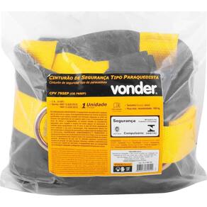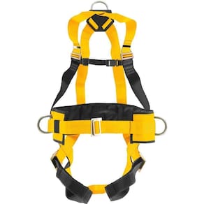 Fabricado em fita de poliéster com ajustes através de fivelas duplas de aço: duas localizadas no suspensório, uma na cintura e duas nas pernas. Possui três meia-argolas em aço forjado bicromatizado: uma dorsal para retenção de queda e duas laterais para posicionamento. Conta ainda com duas alças nos ombros para espaço confinado, duas alças no peitoral para ancoragem frontal, proteção subpélvica e indicador de queda.