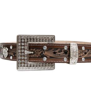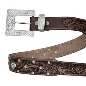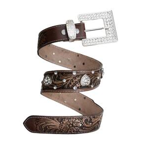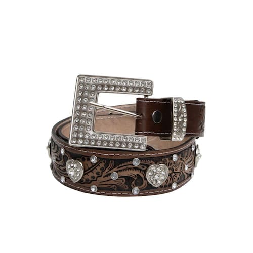 Cinto Feminino Couro Cowgirl Barretao Detalhe Coração Strass Fivela Quadrada Prata Top - Marrom - 95