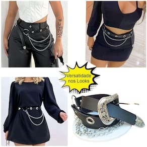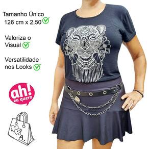 Cinto Feminino Punk Rock com Ilhós e Corrente Dupla. Produto estiloso e moderno que vai dar aquela valorizada no visual. Possui fivela prateada com ponteira e passante prata, dando acabamento no final do cinto. Possui 6 furos, ilhós na lateral e 2 correntes saindo de 2 argolas. Cinto na cor preta com os acabamentos e acessórios na cor prata. Simplesmente lindo! Tamanho único: 126 cm comprimento x 2,50 largura (medida da ponta da fivela até a ponteira). Composição: 100% sintético. Fivela Metal. Atenção: Produto de alto giro. Recebemos novas remessas semanalmente e algum detalhe pode variar conforme o lote recebido, porém o produto é o mesmo e mantém as mesmas características e qualidade. Contém: 1 cinto. Fotos ilustrativas e reais do produto. Não acompanha vestimenta.