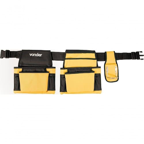Possui cinto ajustável em nylon com presilha para fixação, 3 porta-ferramentas e acessórios, sendo 18 bolsos/divisões e alça metálica para martelo