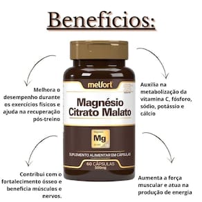 Citrato malato de magnésio 500mg 60caps melfort Descrição: Citrato de magnésio 500mg 60 capsulas - melfort O suplemento de magnésio quelato 500mg da marca melfort é uma excelente opção para quem busca um reforço nutricional. Com 180 cápsulas, cada porção fornece 1.0g de aminoácidos essenciais. Livre de glúten e lactose, é indicado para maiores de 19 anos. As cápsulas são fáceis de consumir e ideais para uso nutricional. Ingredientes: Magnésio citrato malato e antiumectante dióxido de silício. Composição da cápsula: gelatina, umectante glicerina e corante dióxido de titânio. Não contém glúten. Colorido artificialmente Recomendação de uso: Adultos maiores de 19 anos: ingerir 2 duas cápsulas ao dia ou conforme orientação médica e/ou nutricionista. Advertências: Este produto não é um . Não exceder a recomendação diária de consumo indicada na embalagem. Este produto não deve ser consumido po Marca: Não Informado