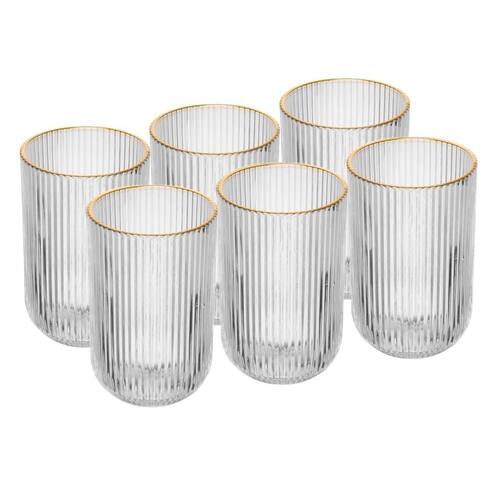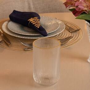 O Conjunto de 6 Copos Altos de Vidro Lines com Fio de Ouro da Wolff é uma opção sofisticada que combina o design contemporâneo de linhas em relevo com um toque clássico de luxo na borda.