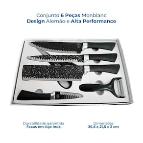 Transforme sua experiência na cozinha com esse kit de facas completo e de alta performance. O conjunto monblanc conta com 6 peças essenciais para o preparo de qualquer prato, unindo qualidade, design moderno e praticidade no dia a dia. -------------------- Itens inclusos - 1 faca chef 20cm - 1 faca trinchar 20cm - 1 cutelo 20cm - 1 faca de descascar 9cm - 1 tesoura multiuso - 1 descascador de cerâmica 9cm ------------------- Material de alta qualidade - lâminas em aço inox com revestimento antiaderente - maior resistência ao desgaste e durabilidade - corte preciso e sem esforço -------------------- Cabo ergonômico e antiderrapante - toque suave com textura antiderrapante - mais conforto e firmeza no manuseio -------------------- Design moderno e funcional - estilo alemão refinado com acabamento sofisticado - estojo elegante para armazenagem e organização - ideal para chefs, cozinheiros e uso doméstico ------------------- Uso multifuncional - corte de carnes, vegetais, frutas, peixes e mais - lâmina com áreas específicas para cada tipo de corte: - frontal: vegetais e frutas pequenas - central: cortes diversos - traseira: alimentos mais resistentes -------------------- Dimensões do estojo: 36,5 x 21,5 x 3cm -------------------- : 90 dias -------------------- Sobre nós: Especificações técnicas: Itens inclusos- 1 faca chef 20cm- 1 faca trinchar 20cm- 1 cutelo 20cm- 1 faca de descascar 9cm- 1 tesoura multiuso- 1 descascador de cerâmica 9cm Marca: Não Informado