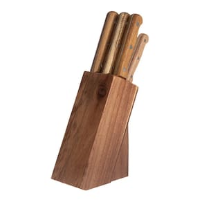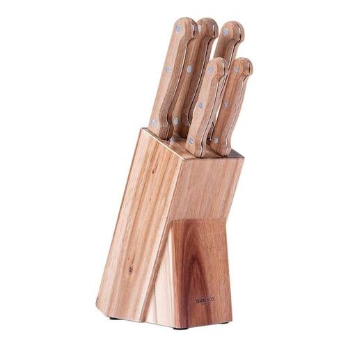 O conjunto de facas Daily é ideal para o preparo de suas receitas com corte de carnes, legumes, pães e outros alimentos com facilidade e precisão.As facas são bem afiadas, produzidas em aço inox, com lâmina chinfrada com rebites que não oxidam. Itens inclusos: 01 Faca do Chef 8”01 Faca para cozinha 7""01 Faca para pão 7”01 Faca para cozinha 4 ½”01 Faca para legumes 3 ½”01 Cepo de madeira.LÂMINA AÇO INOX CHANFRADA e REBITE NÃO OXIDA.