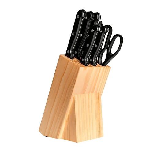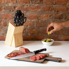 O conjunto de facas Daily é ideal para o preparo de suas receitas com corte de carnes, legumes, pães e outros alimentos com facilidade e precisão.As facas são bem afiadas, produzidas em aço inox, com lâmina chinfrada com rebites que não oxidam.Itens inclusos:01 Faca do Chef 8"01 Faca para desossar 7 ¼01 Faca para pão 7 ½"01 Faca para legumes 3 ½"01 Faca para cozinha 5"01 Tesoura 21,5cm01 Chaira 7 ½”01 Cepo de madeiraLÂMINA AÇO INOX CHANFRADA e REBITE NÃO OXIDA.