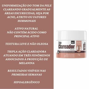 lisa é hipoalergênico, indicado para todos os tipos de pele e pode ser utilizado durante o dia e a noite. Atenção: o resultado do clareador lisa facial é gradual por isso para atingir o resultado desejado é necessário seguir o modo de usar e utilizar o produto diariamente. Ah tente evitar a exposição solar durante o uso. Porém se houver necessidade, não esqueça do uso do filtro solar. Aplique após passar o creme clareador. Como usar: com a pele limpa e seca, aplique uma pequena quantidade do produto no rosto e espalhe suavemente até total absorção. Anvisa processo:25351. 581769/2023-61 aut/ms 201236-1