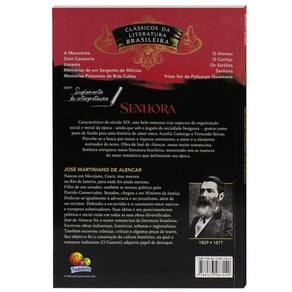 Esta coleção traz grandes clássicos da literatura brasileira, adaptados em linguagem simples e adequada ao público infantojuvenil. É uma excelente ferramenta escolar e até de preparação para concursos, como o vestibular. Traz ainda um suplemento pedagógico ao final de cada livro, que visa testar o entendimento do leitor sobre os textos. ... Característico do século XIX, este belo romance traz aspectos da organização social e moral da época - ainda que sob o ângulo da sociedade burguesa -, postos como pano de fundo para uma história de amor entre Aurélia Camargo e Fernando Seixas. Percebe-se a busca por status e riqueza; entretanto, o amor é o elemento norteador do texto. Obra de José de Alencar, nosso maior romancista, Senhora enriquece nossa literatura brasileira, mostrando-nos as nuances do amor romântico que delinearam sua época. ... José Martiniano de Alencar (1829- 1877) Nasceu em Mecejana, Ceará, mas morreu no Rio de Janeiro, para onde foi ainda menino. Filho de um senador, também se tornou político pelo Partido Conservador. Senador, chegou a ser Ministro da Justiça. Dedicou-se igualmente à advocacia e ao jornalismo, além de ser escritor. Defendia a escravidão e o casamento entre nativos e europeus colonizadores. Suas ideias e seu posicionamento político e social estão em todas as suas obras diversificadas. José de Alencar foi o maior romancista da literatura brasileira. Escreveu obras indianistas, históricas, urbanas e regionalistas. Também escreveu crônicas, críticas e algumas peças de teatro. Seu objetivo foi a construção da cultura brasileira, na qual o romance indianista (O Guarani) adquiriu papel de destaque.