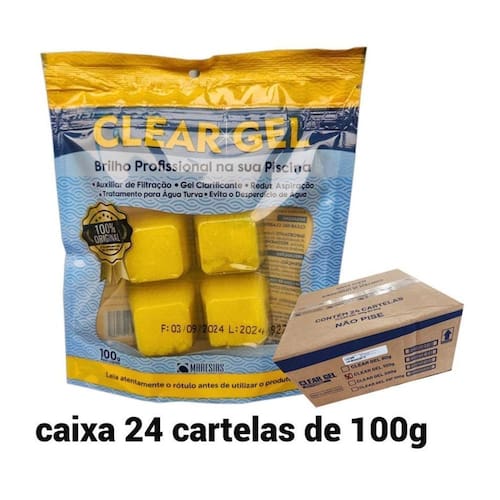 DOSAGEM: Cada unidade clarifica até 25.000 litros de água. Uso semanal. A embalagem contém 4 unidades de Clear Gel.
