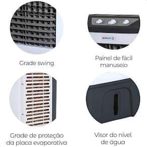 Perfeito para residências, comércios, escritórios e áreas de convivência, o Ultraar 75L é fácil de transportar com rodízios e puxadores, tem compartimento para gelo para potencializar a refrigeração, além de visor de nível de água, 3 velocidades e direcionadores de ar verticais automáticos e horizontais manuais.