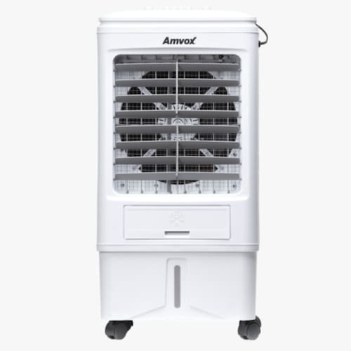 Marca: Amvox. Cor: Branco. Voltagem: 110V ou 220V. Potência: 110V (95W) ou 220V (90W). Frequência: 60hz. Fluxo de ar Max.: 3000 m³/h. Tipo de ventilador: Axial. Consumo de água: 1-2L/h Armazenamento de água: 18L. Velocidades: 3. Resfriamento: Até 20m². Nível de ruido: 60db. Filtro removível: Não. Tipo de filtro: Colmeia. Oscilação do vento: Horizontal (manual) e vertical (automática). Modos de operação: Frio (liga/desliga), Oscilar (liga/desliga). Painel de controle: Mecânico (manual). Swing Automático: Sim. Rodas de Transporte: Sim. Comprimento cabo de energia: 1,70m. Altura: 80cm. Largura: 40cm. Profundidade: 33cm. Peso: 7kg.