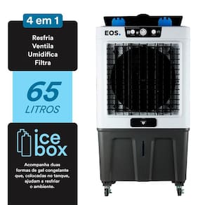O Climatizador de Ar EOS Profissional 65 Litros ECL710M é um dispositivo multifuncional que proporciona conforto e praticidade, oferecendo quatro funções: ventilação, umidificação, filtração e resfriamento. Com um reservatório de 65 litros e uma potência de 175W, é econômico e garante refrescância prolongada sem necessidade de reabastecimento constante. O climatizador inclui formas de gel congelado (Ice Box) para um resfriamento adicional, um filtro de dupla camada que purifica o ar, e sistema de oscilação para distribuir o frescor por todo o ambiente. Também possui proteção para a bomba, desligando automaticamente caso falte água, e rodas para facilitar o transporte.