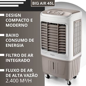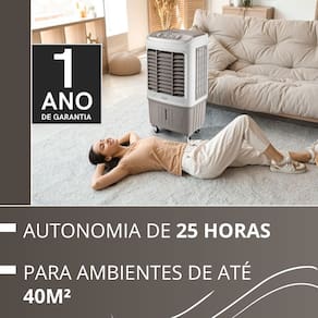 Especificações técnicas: - Potência: 103W - Reservatório de água: 45 litros - Autonomia: 25 horas - 3 níveis de ventilação - Compartimento para Gelo - Design compacto e moderno - 4 Rodas deslizantes com trava - Timer até 2 horas - Compartimento para Gelo: Sim - Painel Eletrônico: Não - Indicação de Nível: Sim - Air Swing: Sim - Vazão de Ar: 2400 m3/h