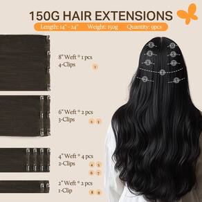 - Extensões de cabelo 150 g de peso – Super espesso: cada conjunto inclui 9 peças com 20 clipes, pesando 132 g sem clipes e 150 g com clipes. Melhoramos a versão autêntico de 120 g adicionando 2 peças de trama de 2 clipes. Um pacote adequado para a maioria das necessidades