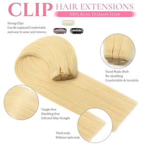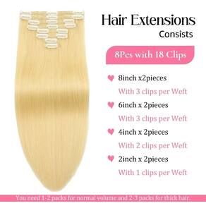 Detalhes das extensões de cabelo humano com clipe: Tipo de cabelo humano: clipe em extensões de cabelo humano real. Materiais de extensões de cabelo com clipe: 100% cabelo humano Remy. Comprimento: 35,5 cm, 40,6 cm, 45,7 cm, 50,8 cm, 56 cm, 61 cm disponíveis. Peso: 35.6 cm-90g, 40.6 cm-100g, 45.7 cm-100g, 50.8 cm-105g, 55.9 cm-110g, 61.0 cm-120g. Textura do cabelo humano: liso - ?Extensões de cabelo com clipe no material de cabelo humano real?: nossas extensões de cabelo liso são feitas de 100% cabelo humano virgem remy não processado. Nossas extensões de cabelo humano real com clipe são limpas/macias/saudáveis/sem queda/sem emaranhamento/sem química. O clipe em extensões de cabelo humano real é fácil de ser tingido/enrolado/reestilizado. Escolhemos cabelos de alta qualidade, tão bons quanto o seu próprio cabelo. - ?Grampo de cabelo humano em extensões?: extensões de cabelo humano com clipe, 8 peças 90-120 g com 18 clipes por conjunto. O comprimento para extensões de cabelo humano com clipe reto: 35.6 cm-90g, 40.6 cm-100g, 45.7 cm-100g, 50.8 cm-105g, 55.9 cm-110g, 61.0 cm-120g. De acordo com o volume do seu cabelo, geralmente 1-2 pacotes podem preencher toda a sua cabeça, aumentando o comprimento e o volume. Se você tem cabelo grosso, recomendamos comprar mais de 2 pacotes para alcançar um resultado perfeito - ?Vantagem das extensões de cabelo humano?: penteie facilmente, lave facilmente e cuide facilmente. Você pode usar facilmente e remover os clipes sozinho para mudar o penteado para diferentes ocasiões. Ao contrário das extensões de cabelo tradicionais com clipe reto, as extensões de cabelo sem fita não têm cola, não danificam o couro cabeludo e o cabelo, podem se misturar perfeitamente com a cor do seu cabelo. - ?Dicas de cuidados com extensões de cabelo com encaixe?: esfregue seu cabelo suavemente enquanto o lava. É necessário um pouco de xampu suave e condicionador de cabelo, depois lave com água morna e deixe secar naturalmente. Antes e depois do uso, lembre-se de escovar suas extensões de cabelo suavemente com uma escova de cerdas macias. - ?Serviço pós-venda e dicas de cores?: se você não ficar satisfeito com o produto de extensões de cabelo com clipe, por e-mail, faremos o nosso melhor para ajudá-lo a resolver o problema do produto rapidamente! As cores semelhantes à imagem real podem diferir ligeiramente das cores exibidas devido à iluminação, exibição e configurações