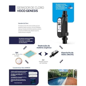 Gerador de Cloro Veico Genesis 20PRO - Piscinas até 60.000 Litros Tenha mais praticidade com o Gerador de Cloro Veico Genesis 20PRO. Compatível com piscinas de até 60.000 litros, ele realiza a cloração por eletrólise salina de forma automática. Possui visor digital, sistema autolimpante e conectividade via Wi-Fi. Mantenha sua piscina sempre limpa e segura com o Gerador de Cloro Veico Genesis 20PRO. Utilizando tecnologia de eletrólise salina, este equipamento produz cloro automaticamente, eliminando a necessidade de dosagens manuais. Destaques Compatível com piscinas até 60.000L Wi-fi integrado para controle remoto Autolimpante com reversão de polaridade Painel digital com status em tempo real Fabricado pela Fluidra, referência mundial em tratamento de água O que acompanha: 1 Clorador Veico Genesis 20PRO Kit de instalação Manual técnico de fábrica Especificações Técnicas Tensão: Bivolt 110V/220V Produção de Cloro: 20g/h Instalação: Linha hidráulica de retorno Conexões: 50mm / adaptável Vantagens Menos produtos químicos Ideal para crianças e alérgicos Reduz manutenção e custos com cloro granulado Produto silencioso e ecológico Suporte e Marca: Não Informado