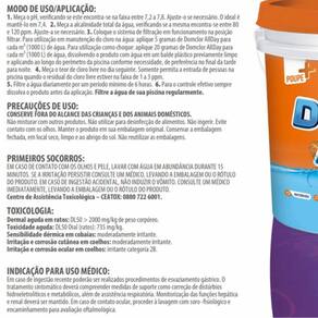 Elimina e previne microrganismos na água da piscina, ideal para choque ou manutenção, garantindo proteção contínua. Para utilização em manutenção do cloro na água: aplique 5 gramas de Domclor AllDay para cada m 1000 L de água. Para utilização como choque: aplique 20 gramas de Domclor AllDay para cada m 1000 L de água, dissolvendo o produto com água em um balde plástico previamente limpo e aplicando ao longo do perímetro da piscina Marca: Não Informado