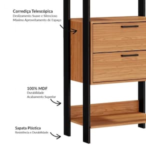 Características: Estrutura 100% MDF Acabamento em Pintura UV 02 Gavetas com Corrediças Telescópicas Puxadores Plásticos Prateleiras Sapatas Plásticas Estilo Industrial