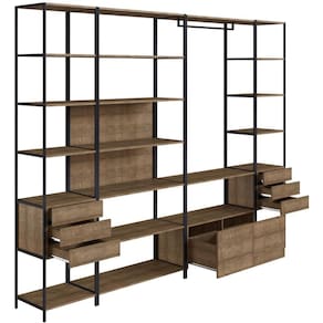 Cor: Vermont, Preto | Materiais: MDP, Aço | Material da estrutura: Madeira | Tonalidade: Marrom | Linha: Steel Quadra | Estilo de Decoração: Industrial | Marca: Artesano | Atributos: Sofisticado, Resistente, Versátil, Pratico | Área de Uso: Interna | Garantia (tempo): 6 meses | Garantia (descritivo): Garantia contra defeitos de fabricação de 06 meses. Consulte as nossas políticas. | Peso (kg): 87.23 | Largura (cm): 270.00 | Profundidade (cm): 38.00 | Altura (cm): 211.50 | Entregue Montado?: Não | Possui Manual de Montagem?: Acompanha o Produto | Origem do Produto?: Nacional | Conservação e Manutenção: Limpeza com pano úmido em solução de água e detergente neutro. Secar em seguida. | Acabamento: Fosco | Tipo de Corrediça da Gaveta: Roldana Metálica | Número de Gavetas: 4 gavetas | Número de Prateleiras: 7 prateleiras | Tamanho: Grande | Estado de Origem: RS | Conteúdo da Embalagem: 3 Estantes | Montagem: Desmontado | Produto: Closet 3 Estantes Industrial Steel Quadra Artesano 270 cm (largura) MDP Vermont Estrutura Aço Preto | Peso Suportado (kg): 110.00