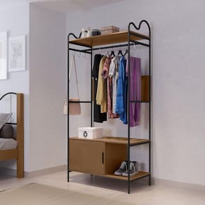 Apresentamos o Closet Aberto Oasis, um novo conceito de guarda-roupa. Produzido em aço com pintura epóxi e em M.D.F. com pintura UV, unindo resistência e beleza, ajudando a organizar ambientes, sendo assim prático e moderno. Acabamento da Porta: Pintura Acabamento dos Pés: Epóxi Altura dos Pés: 13 cm Ambiente Principal: Quarto Complexidade da Montagem: Média: pode ser montado por mais de uma pessoa e/ou necessite de maior conhecimento para montagem Composição: 65% MDF e 35% AÇO Cor: Preto/Marrom Cor do Produto: Preto/Marrom Cor Interna: Marrom Escala de Brilho: Semi-Fosco Espessura do Material da Estrutura: 20 mm Itens Inclusos: 1 Closet e manual de montagem Linha ou Coleção: Oasis Manual de Montagem e Instalação: https://product-hub-prd.madeiramadeira.com.br/885265/documents/963652b2-4ca9-4ec3-9a72-265c11b2f20fmanualmontagemclosetaberto.pdf Material da Porta: MDF Material dos Pés: Aço Material Principal: MDF Módulo Individual: Sim Necessita Montagem: Sim Origem do Produto: Nacional Pés Reguláveis: Não Peso: 25,84 kg Possui Cabideiros: 01 Possui Calceiros: Não Possui Espelho: Não Possui Possui Pés: 04 Possui Portas: 01 Possui Prateleiras: Não Possui Rodízio: Não Recomendações de Uso, Manutenção e Limpeza: Pano levemente umedecido com água, seguido de pano seco, não utilizar produtos químicos ou abrasivos. Sapatas Niveladoras: Não Sistema de Montagem: Parafusos Suporta Até (kg): 20 kg Tipo de Dobradiça/Corrediça da Porta: Metálica Tipo de Puxador da Porta: Interno