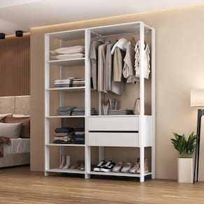 O closet é equipado com 7 prateleiras espaçosas (suportam até 8kg em cada), ideais para acomodar suas roupas e calçados favoritos com estilo e organização inigualáveis. O cabideiro de madeira revestido garante que suas roupas, sejam longas ou curtas, fiquem sempre impecáveis. Além disso, com 2 gavetas que possuem corrediças metálicas, o manuseio dos seus pertences ganha leveza e praticidade. Valorize cada peça do seu vestuário com um design aberto e moderno que realça qualquer espaço.