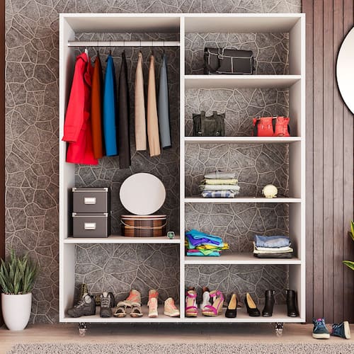 Organização Inteligente: Possui cabideiro em alumínio, prateleiras para roupas dobradas, nichos para bolsas e base reforçada para sapatos.